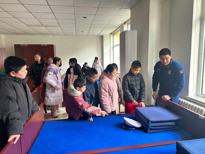 “被子居然方得像块积木!”参观宿舍时,孩子们盯着床上棱角分明的被子,手痒痒地想碰又缩回手。消防员叔叔演示“三分叠七分修”,指尖捏着被角一点点抠出直线,“叠被子练的是耐心,灭火时这点耐心能救命。”这句话像颗种子,悄悄落进孩子们心里。